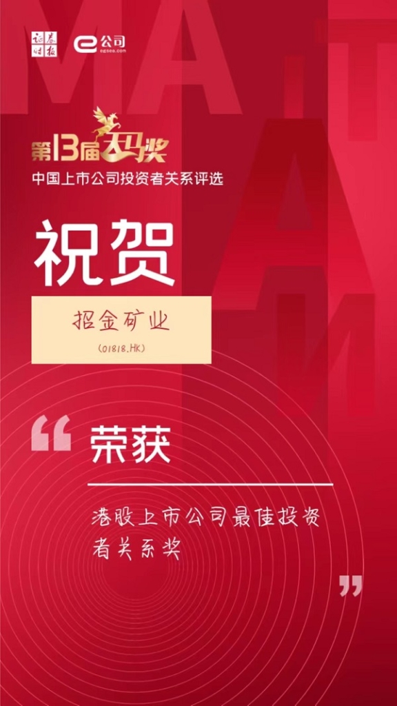 此次招金礦業(yè)榮獲天馬獎“港股上市公司最佳投資者關系獎”,彰顯了投資者對公司業(yè)務發(fā)展、治理水平以及投資者關系工作的認可,體現(xiàn)了公司資本市場的品牌影響力。未來,招金礦業(yè)將繼續(xù)深耕主業(yè),穩(wěn)健經營,不斷提升投資關系質量,回報廣大投資者對公司的信任。