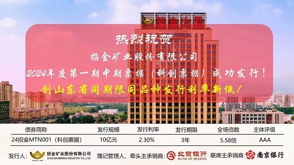 近日,招金礦業持續精準研判市場趨勢,搶抓市場發行窗口期,成功發行2024年第一期中期票據,發行規模10億元,期限3年,票面利率2.3%,創山東省同期限同品種發行利率新低。