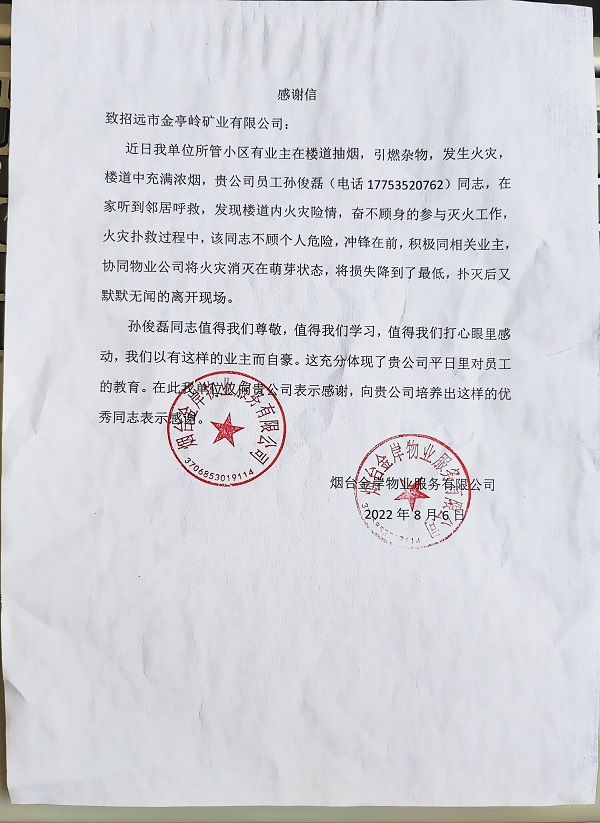 因為孫俊磊對火情處置及時得當,火情在第一時間得到了有效控制,在最短時間內被撲滅,各種損失被降到了最低。事后,他守口如瓶,從未向同事及朋友提及此事,若不是這封感謝信,他會一直“瞞”下去。他說:“我在礦上就兼職應急救護隊員,無論是在單位,還是在生活中,遇到這種情況理應沖鋒在前。火警響起迎火而上,這是我義不容辭的職責。”