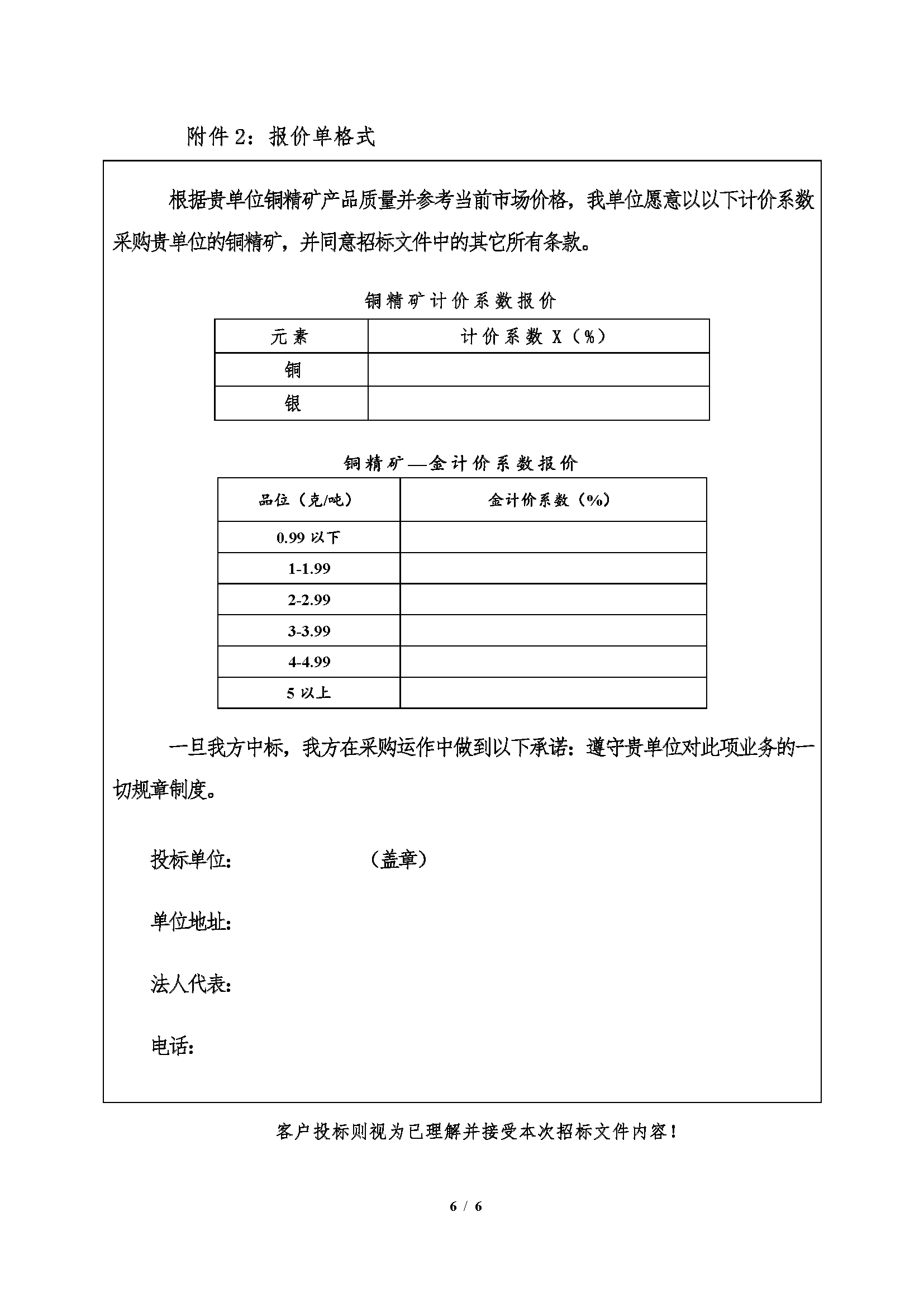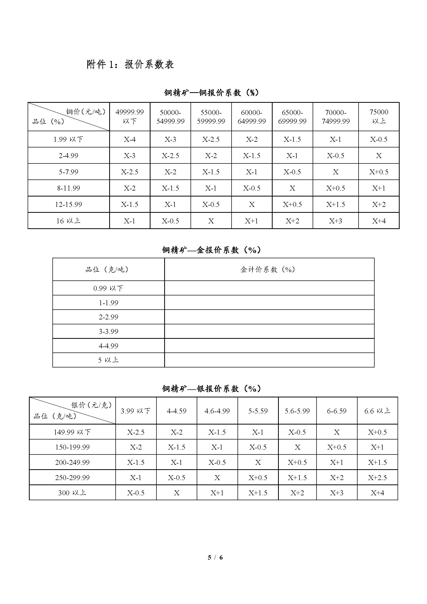 2.本次招標為一次性報價,在標書報送截止后現場制定底標并在規定時間內進行開標。本次招標以我單位檢測的本批次礦各元素平均品位對應的報價系數測算出綜合單價,每干噸礦計算的價值最高者得。