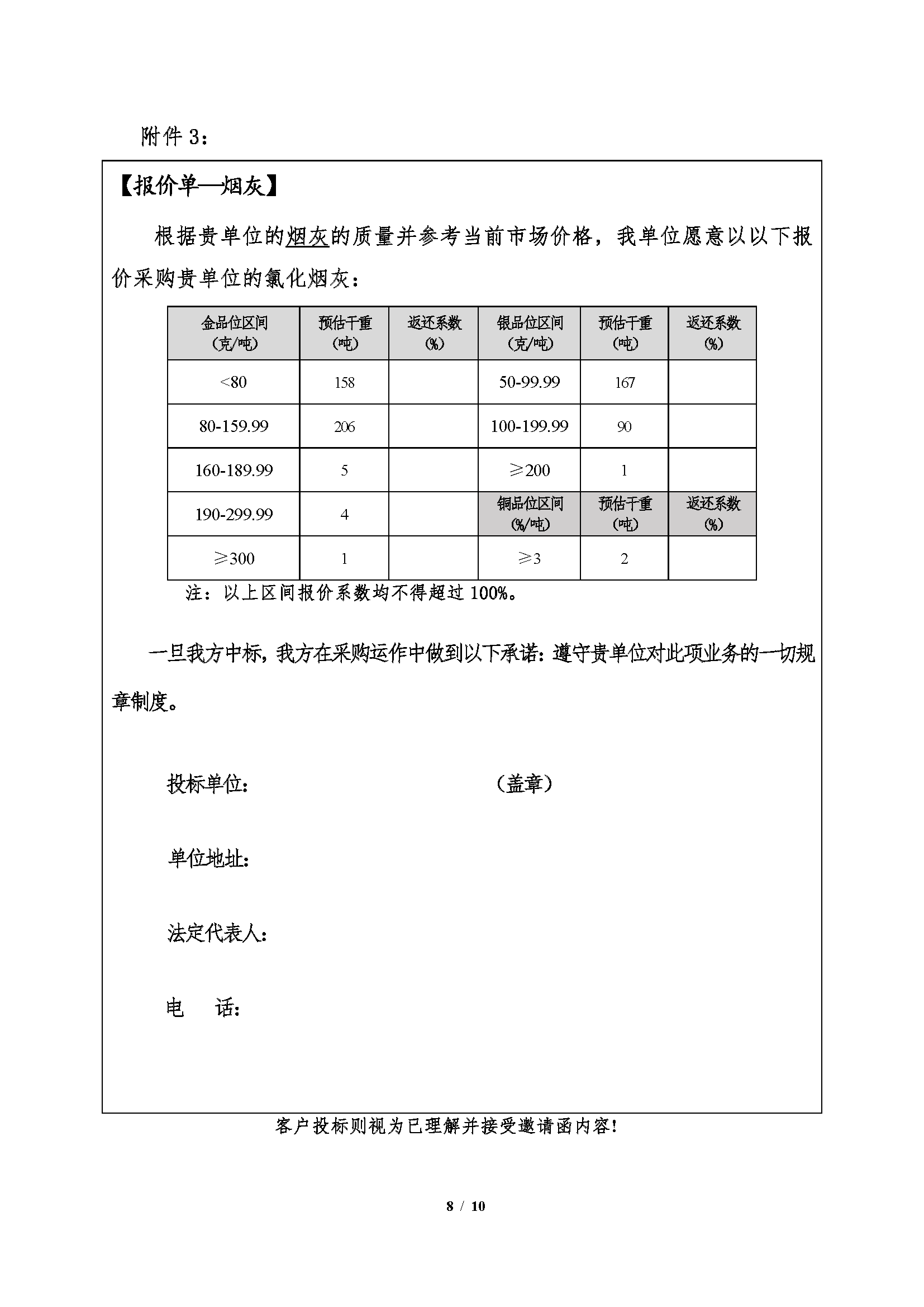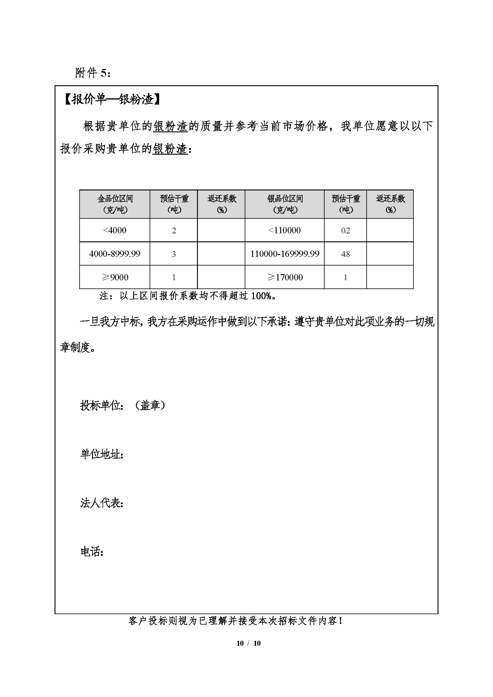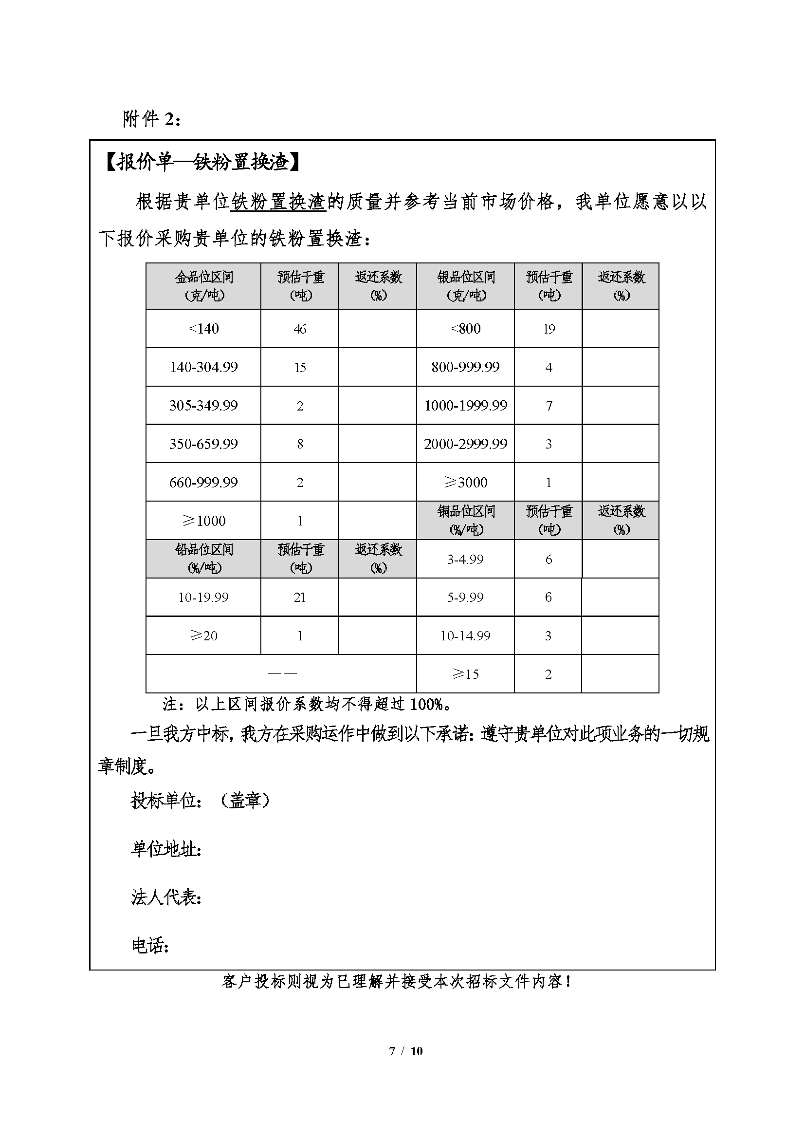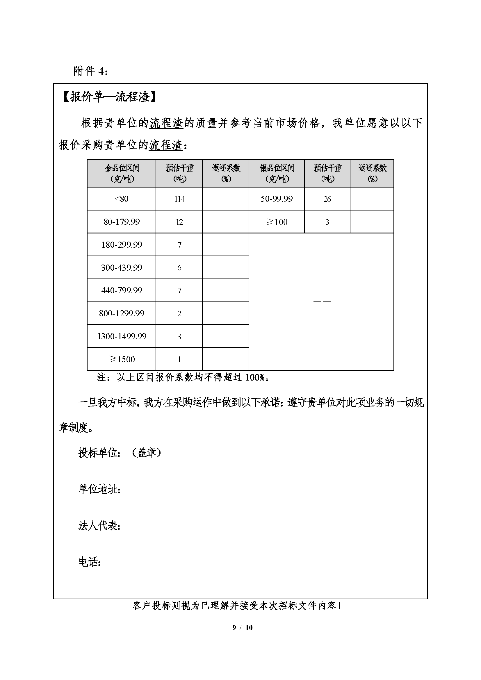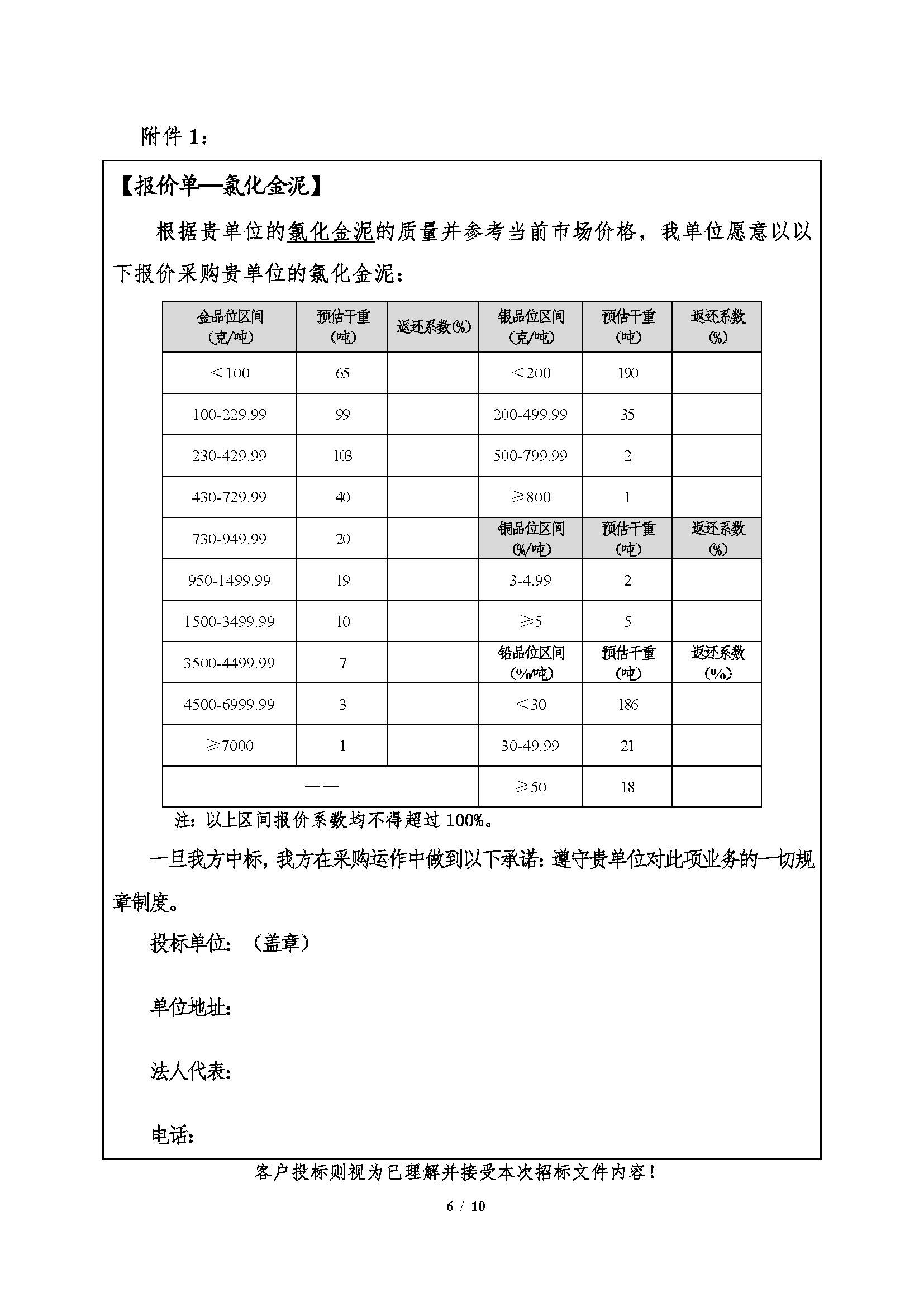 注:1、氯化金泥、鐵粉置換渣、煙灰、流程渣為捆綁銷售,以四種產品的合計綜合價值確定中標單位,單項投標視為棄標;銀粉渣按照其綜合價值單獨中標。
