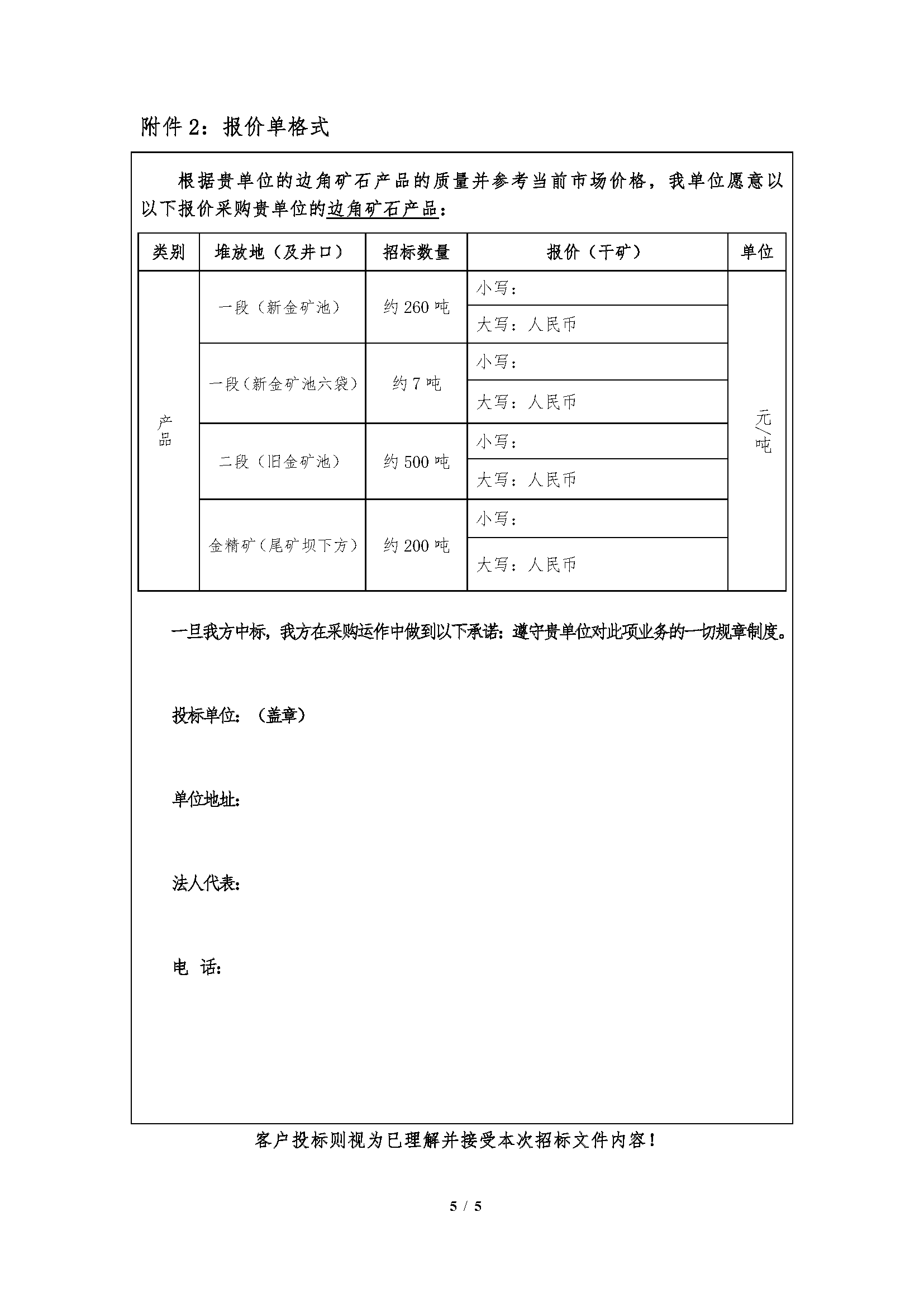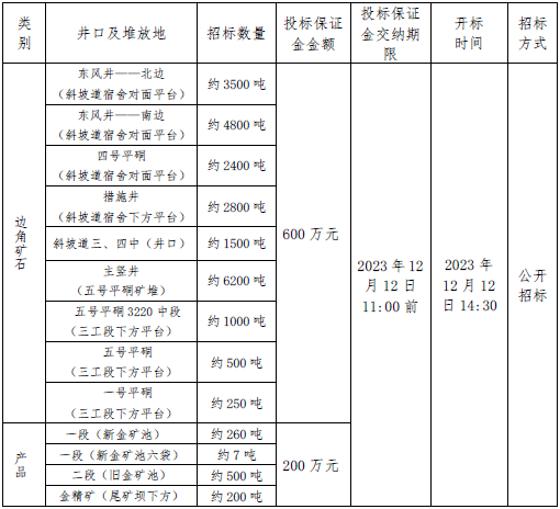 注:本次招標產品數量為預估數,投標按干礦報價,中標結算濕礦以實際過磅數為準,邊角礦石水分按2%扣除計算干礦,產品水分由中標人及我公司相關科室、車間人員現場取樣、我公司化驗室的水分數據為準。如中標人需要,我公司開具甘肅省增值稅普通發票(黃金)。
