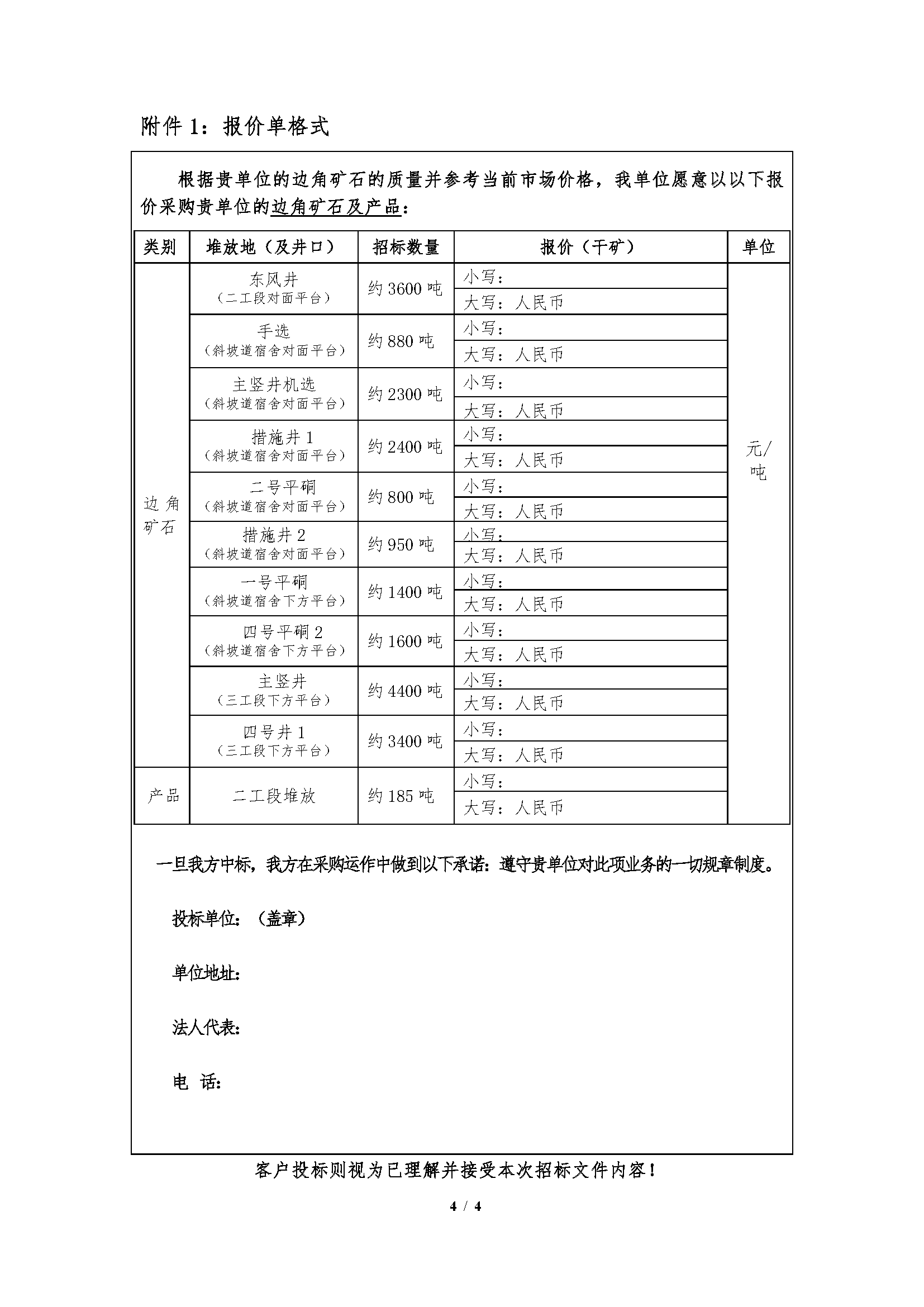 注:本次招標產品數量為預估數,投標按干礦報價,中標結算濕礦以實際過磅數為準,水分按2%扣除計算干礦;邊角礦石產品水分由中標人及我公司相關科室、車間人員現場取樣、我公司化驗的水分數據為準。如中標人需要,我公司開具甘肅省增值稅普通發票(黃金)。