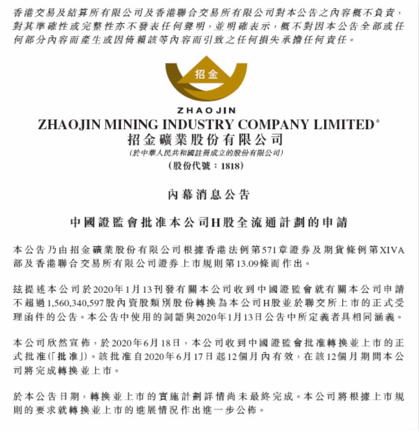 經(jīng)中國(guó)證監(jiān)會(huì)批準(zhǔn),招金礦業(yè)股份有限公司于今日正式獲得H股“全流通”資格。資格獲批意味著招金礦業(yè)將有不